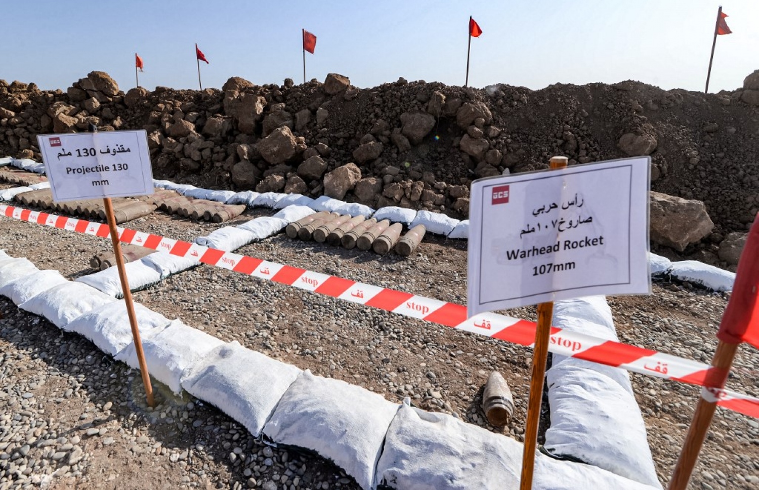 Ordnance awaiting disposal is left in a desert area behind a banner that reads "STOP".