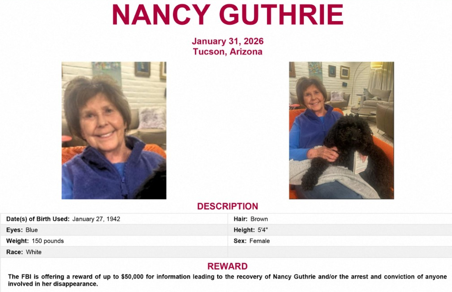This image released by the Federal Bureau of Investigation (FBI) on February 5, 2026 shows the Missing Person Poster for Nancy Guthrie, mother of NBC News "Today" co-host Savannah Guthrie. On February 5, detectives searching for the kidnapped mother of a top US TV news anchor said blood discovered on her doorstep belonged to the missing 84-year-old woman, in the latest twist in a case that has gripped America. Nancy Guthrie, mother of NBC News "Today" co-host Savannah Guthrie, is believed to have been kidnapped from her home in Tucson, Arizona, some time on the night of January 31 or on the morning of February 1, sparking a massive hunt and a race against time to find her.