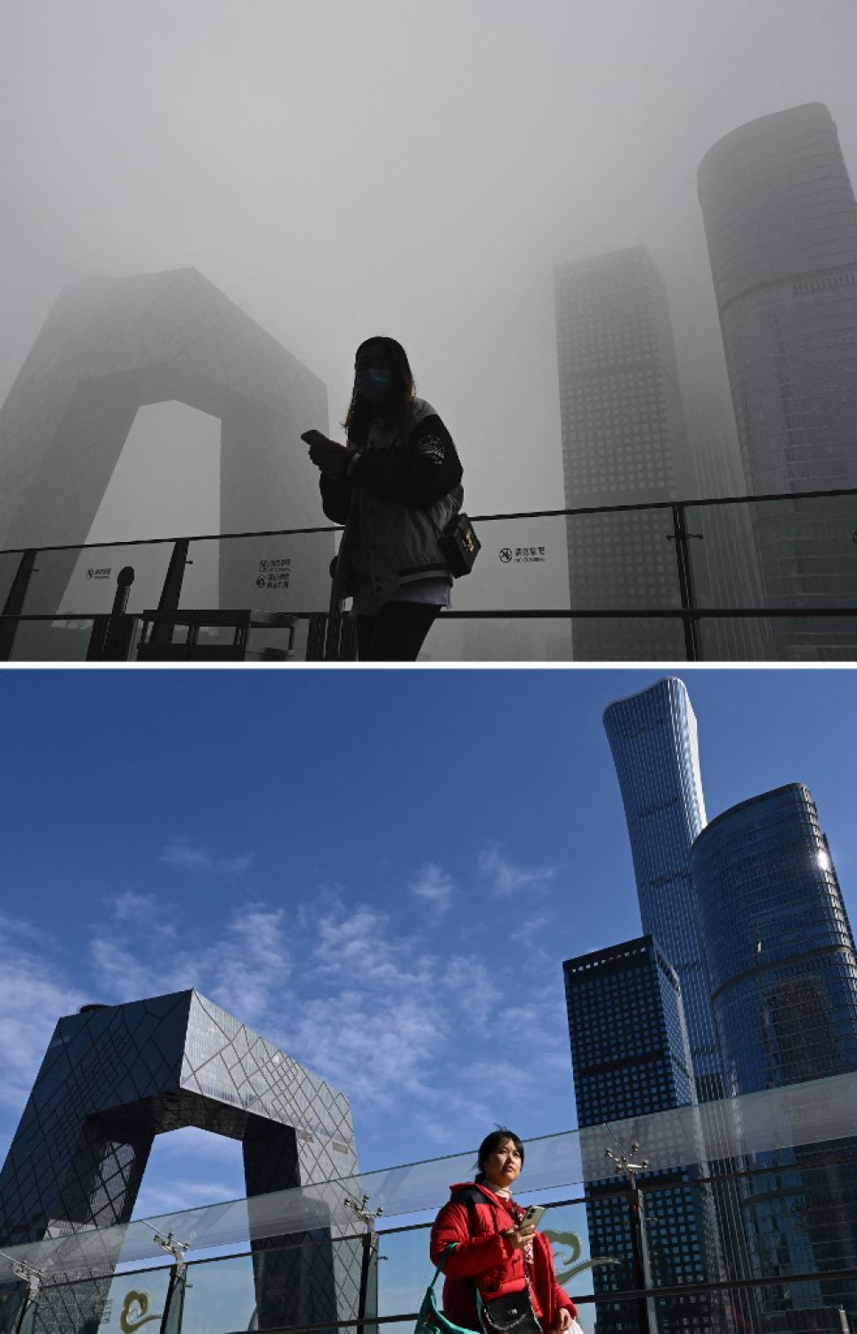 (COMBO) This combination of two pictures created on February 16, 2026 shows a pedestrian beside a glass wall as the China Central Television (CCTV) headquarters is seen in the background on a polluted day in Beijing on November 5, 2021 (top), and a similar view of a pedestrian at the same location on a clear day on February 11, 2026 (bottom). Fifteen years ago, Beijing's Liangma riverbanks would have been smog-choked and deserted in winter, but these days they are dotted with families and exercising pensioners most mornings.