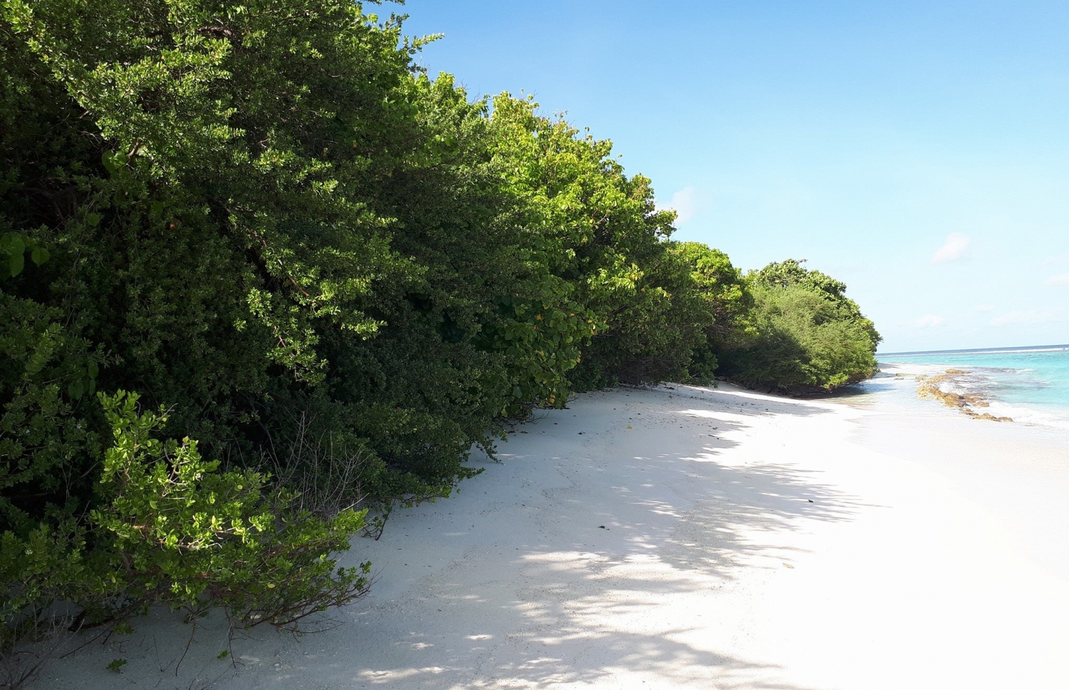 A rare phenomenon that occurs in Fainu every year is that of the natural formation of a small lagoon within the existing beach. This occurrence in local terms is known as ‘ Kuda Moodhu’ or ‘ Beessaa Veli’. It is something that the islanders’ and neighbouring islanders’ look forward to every year. Family get-togethers, specifically among children, are enjoyed here due to the protectiveness the enclosed lagoon offers.